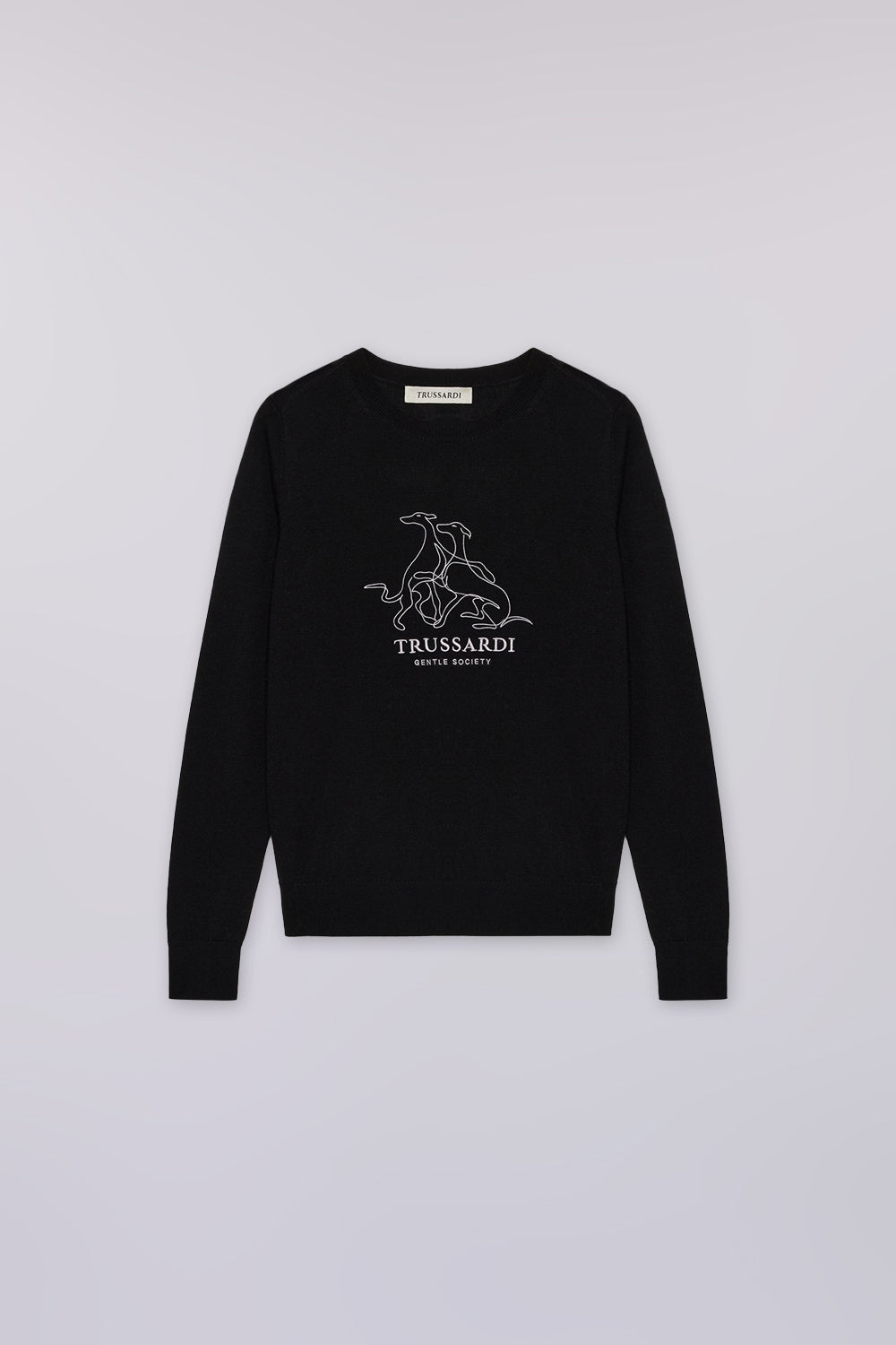 A wool-blend crew neck sweater that embodies Trussardi's sophisticated minimalism. The Gentle Society embroidery featuring the iconic greyhound adds a unique style element. This sweater naturally pairs with leather trousers for a refined urban look. The versatility of this piece makes it perfect for both office wear and after-work drinks, expressing timeless style with a modern twist. A garment that blends elegance and practicality, aligned with the brand's values.