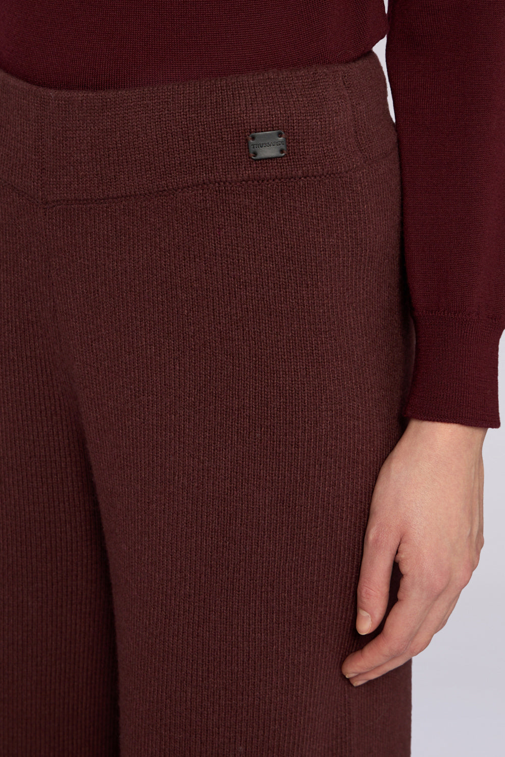 Elegance meets comfort in these ribbed knit wool-blend trousers. The elasticated waistband ensures a comfortable fit, while the wide, flowing leg creates a sophisticated and modern silhouette. Perfect for the dynamic woman who loves style, they effortlessly transition from office wear to evening outings. Pair them with a turtleneck for a refined ensemble or with an oversized shirt for a more casual chic look. The Trussardi logo detail adds an elegant signature touch.