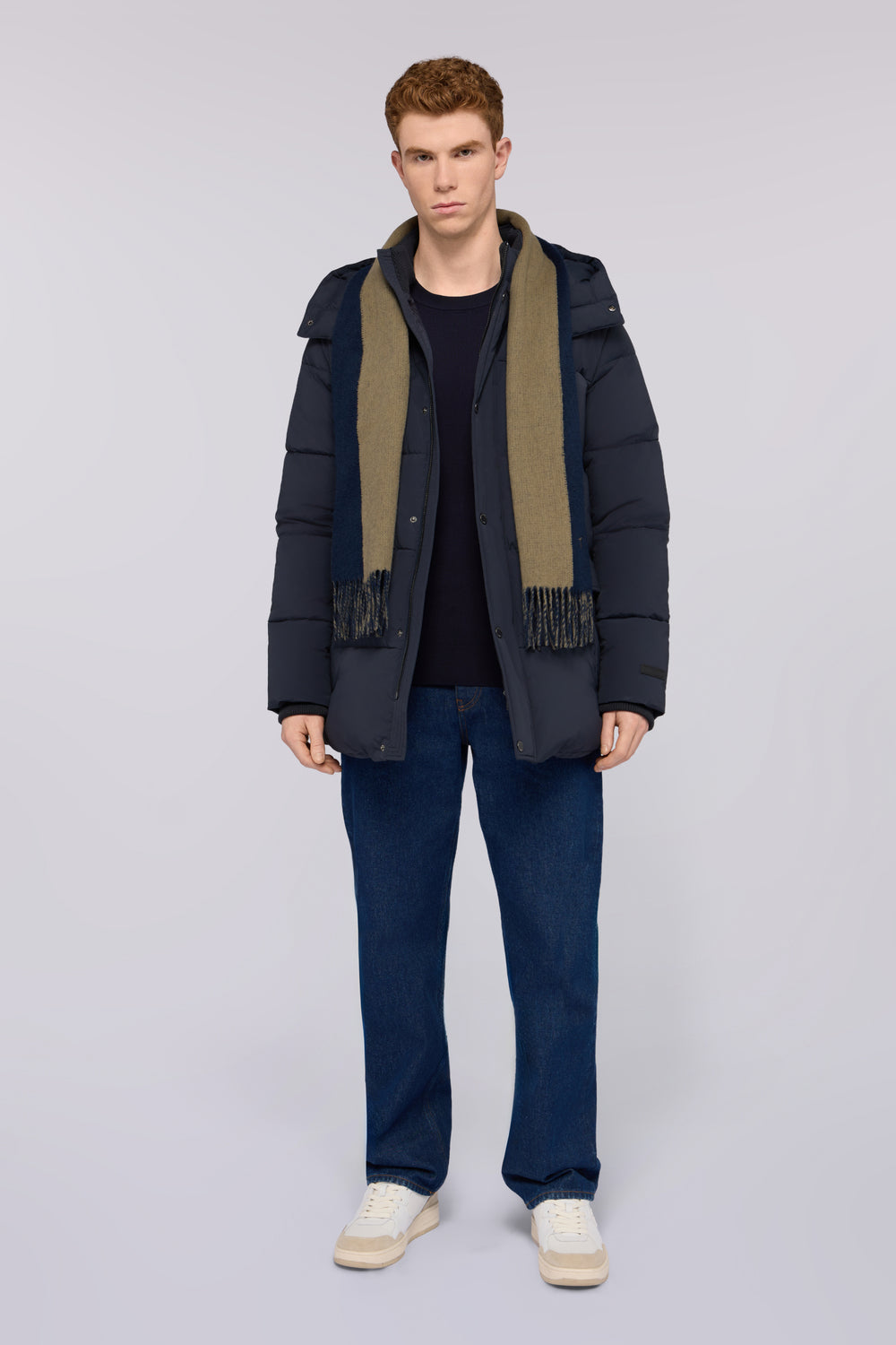 Chaqueta acolchada en nylon laminado con capucha desmontable, tirantes internos extraíbles, bolsillos frontales con solapa y bolsillo con cremallera en el pecho, interior del cuello en pana de mil rayas.