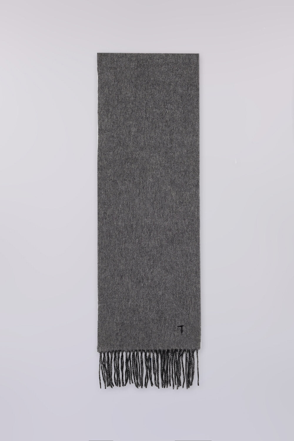 Écharpe en pure laine Trussardi avec franges et broderie lévrier, alliant confort et élégance.