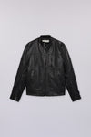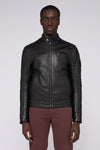 Giubbotto biker in vera pelle metal free con zip centrale, tasche laterali, taschino frontale, collo in maglia e fodera jacquard Gentle Society.